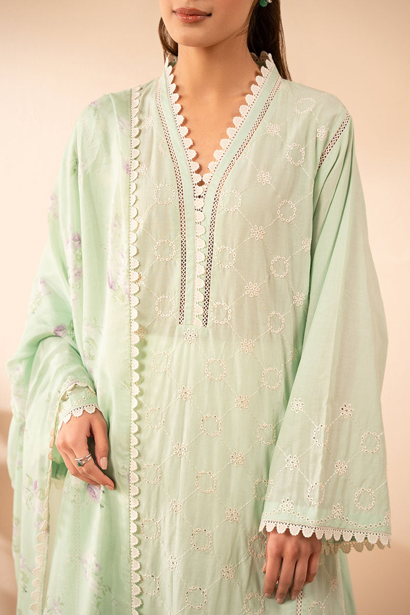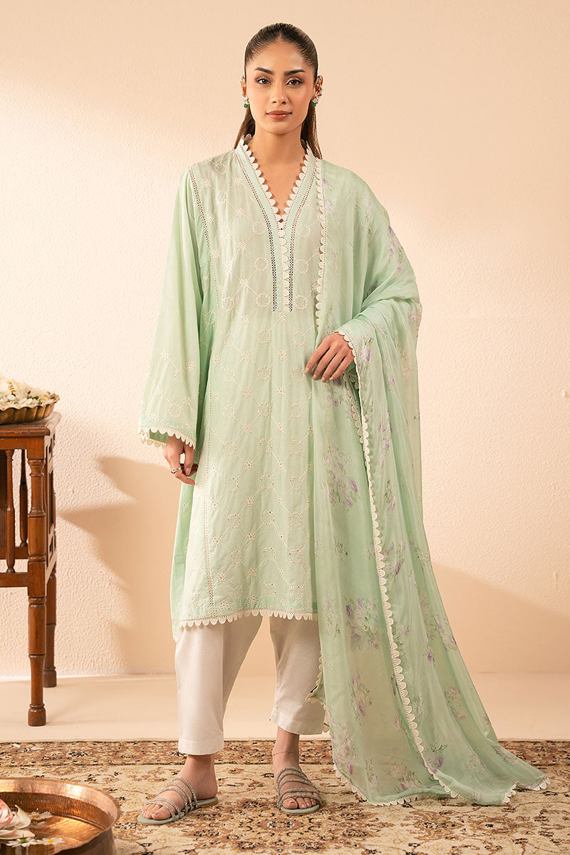 - The Green Somber-2-Piece Is A Stylish Ensemble Perfect For Any Occasion. The A-Line Shirt Features Beautiful Panels Made Of Soft Lawn Fabric And Adorned With Intricate Schiffli Embroidery And Lace Accents. The Wrap-Around Neckline Is Finished With Delicate Lace Insertions For A Touch Of Elegance. The Back Is Plain Dyed For A Simple Yet Sophisticated Look. The Silk Printed Dupatta Is Finished With Laces, Adding A Touch Of Luxury To The Overall Ensemble. Look And Feel Your Best In This Timeless 2-Piece Set.