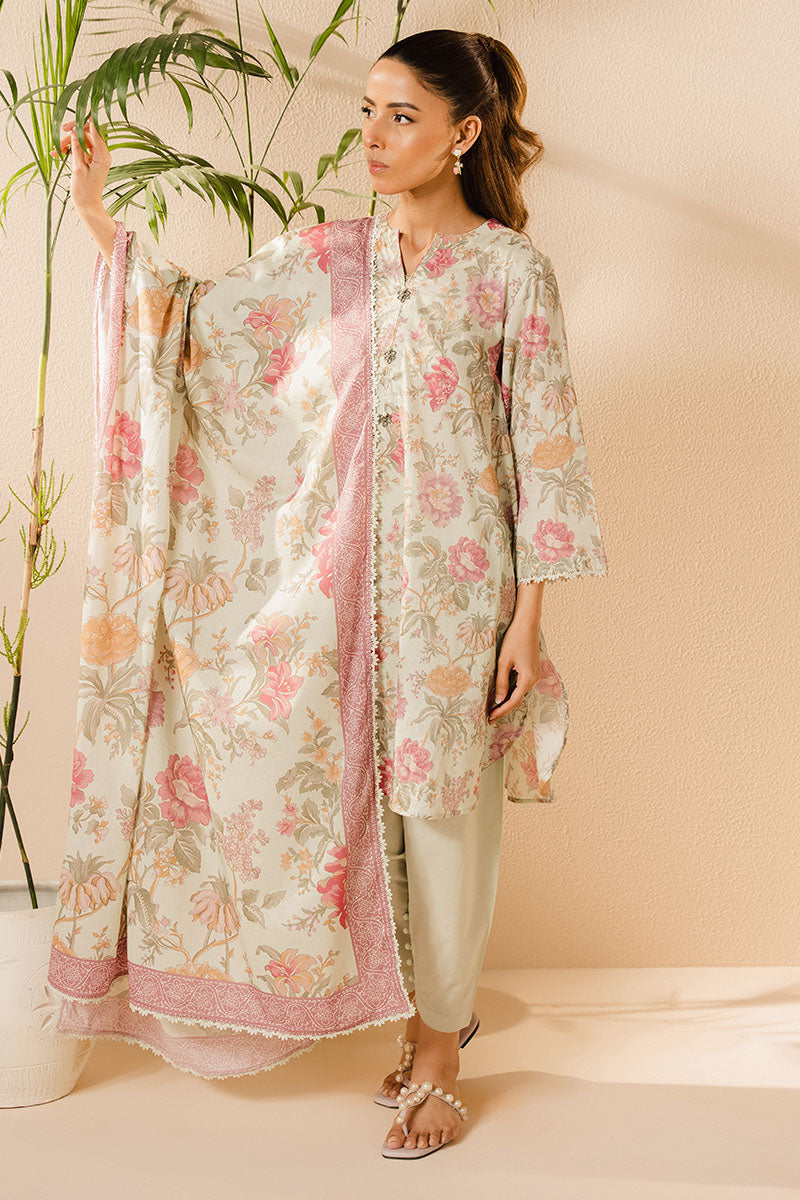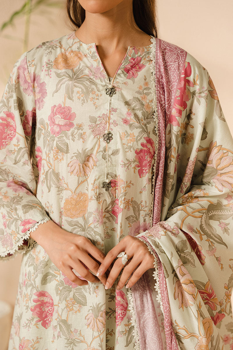 - Elevate Your Summer Wardrobe With The Minty Bloom-3Pc Set. The A-Line Shirt Features A Stylish Round Hem And Vibrant Front And Back Prints. The Crew Neck With Button Detail Adds A Touch Of Elegance, While The Flared Sleeves With Lace Finish Provide A Graceful Flair. The Tapered Lawn-Printed Shalwar And Printed Dupatta Complete The Ensemble For A Chic And Trendy Look.