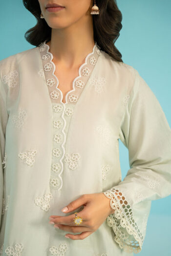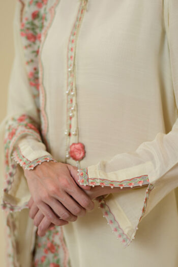 - Introducing the Noir Shell, a sophisticated two-piece ensemble crafted from premium karandi fabric. This boxy-cut shirt features a meticulously pleated front with a classic shirt collar and regular sleeves, offering timeless elegance. The back remains understated and plain, allowing the front detailing to command attention. Paired with culottes in matching karandi, this set showcases delicate embroidery at the hem of the trousers, adding refined texture and visual interest. Perfect for those who appreciate structured silhouettes and subtle embellished accents, this ensemble balances contemporary styling with traditional craftsmanship.