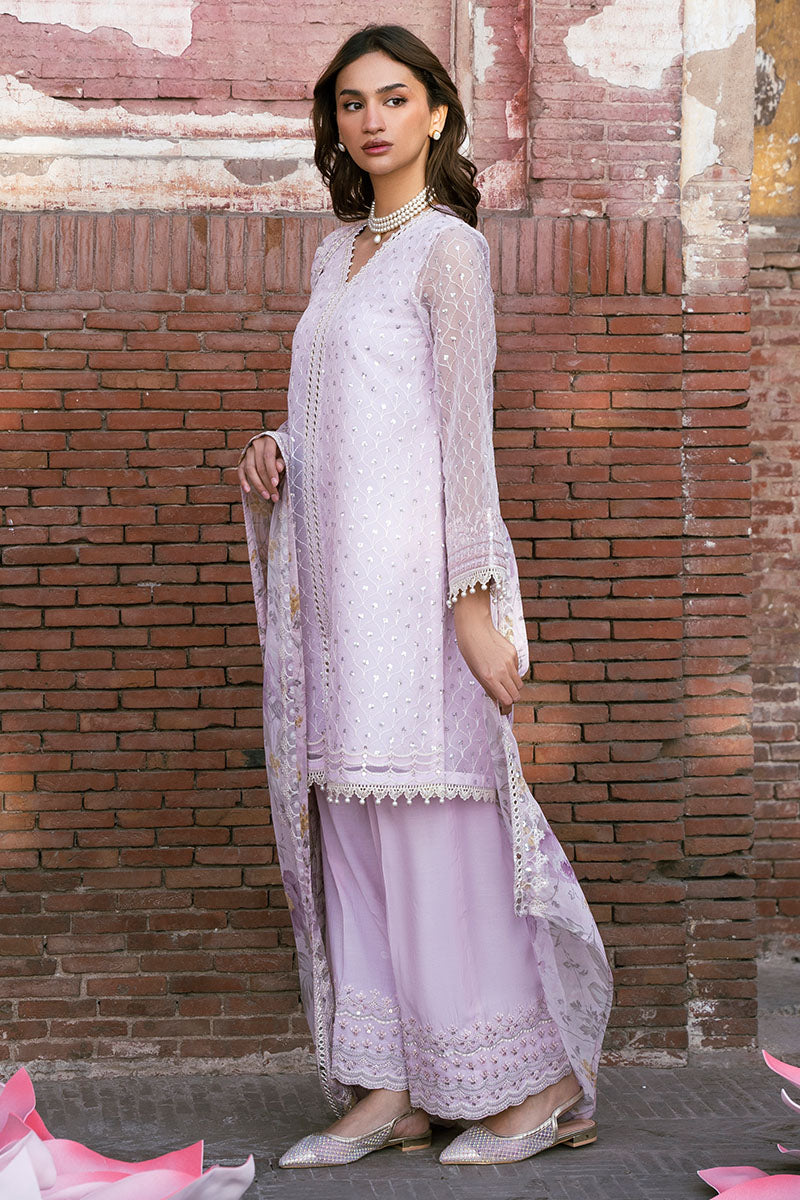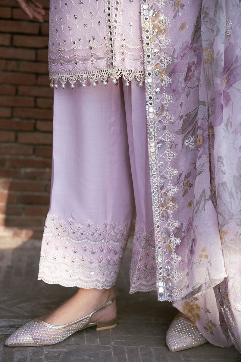 - This Petal Splash-3Pc Set Includes A Front Open Jacket-Style Shirt With Exquisite Sequin Embroidery, Embellished Neckline, And Lace-Detailed Sleeves. The Silk Trouser Features A Comfortable Culotte Style While The Dupatta Completes The Elegant Look With Embroidered Print Chiffon. Perfect For A Formal Event Or Fancy Occasion.