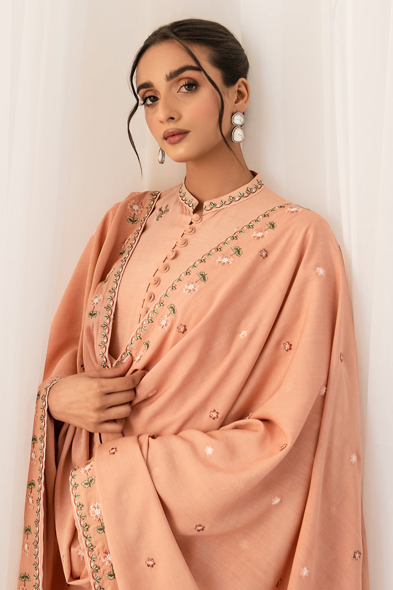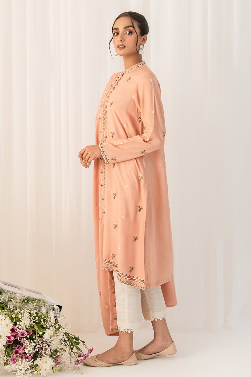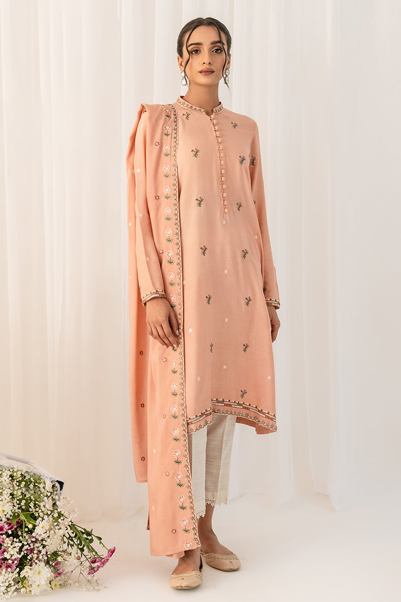 Rtw Sand Pink Is A Tailored Shirt Crafted From Linen With A Stylish Straight Fit. The Embroidered Front And Plain Dyed Back Create An Elegant Contrast, Finished By A Band And Button Embroidered Neckline. The Linen Embroidered Dupatta Further Elevates The Look With Timeless Sophistication.
