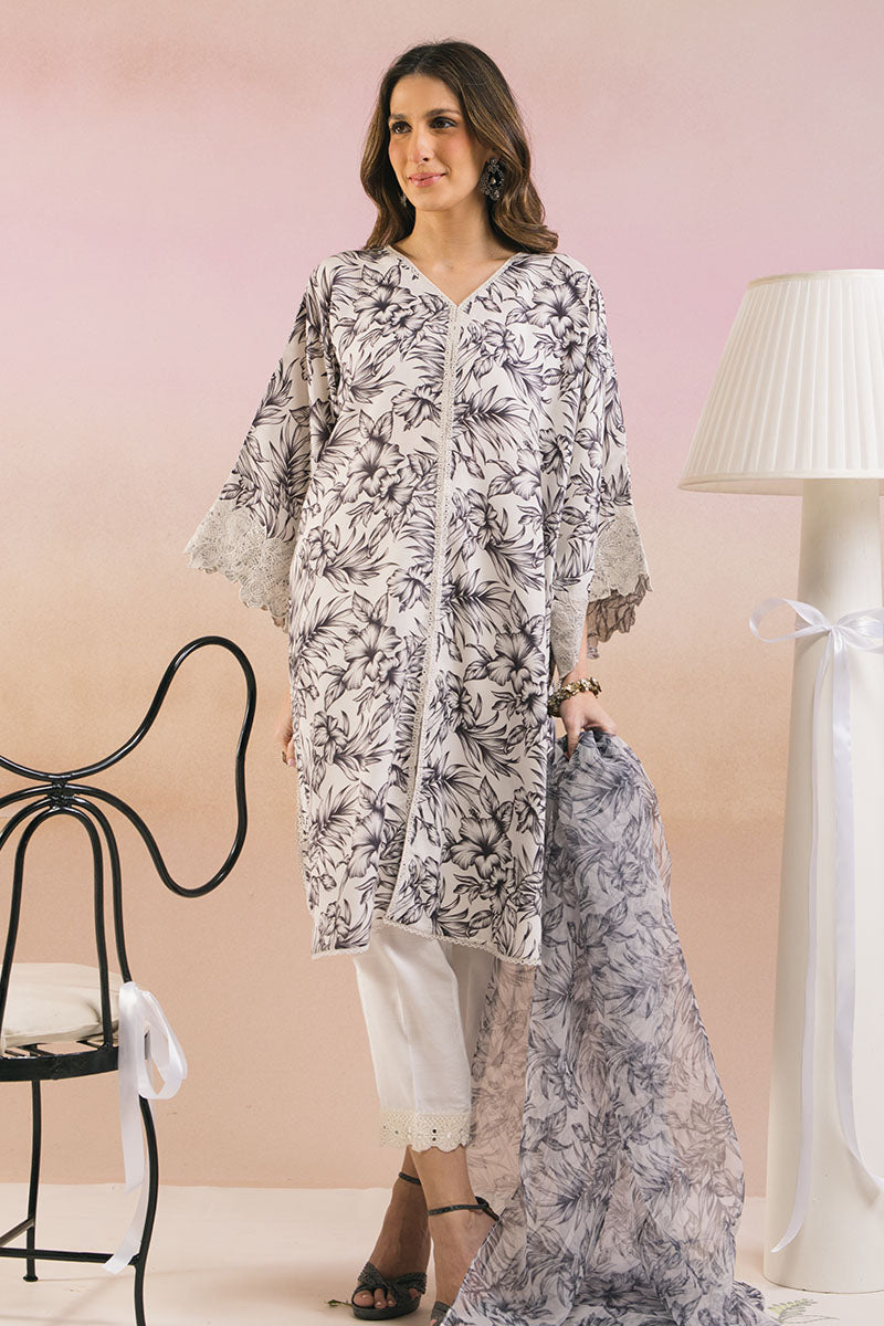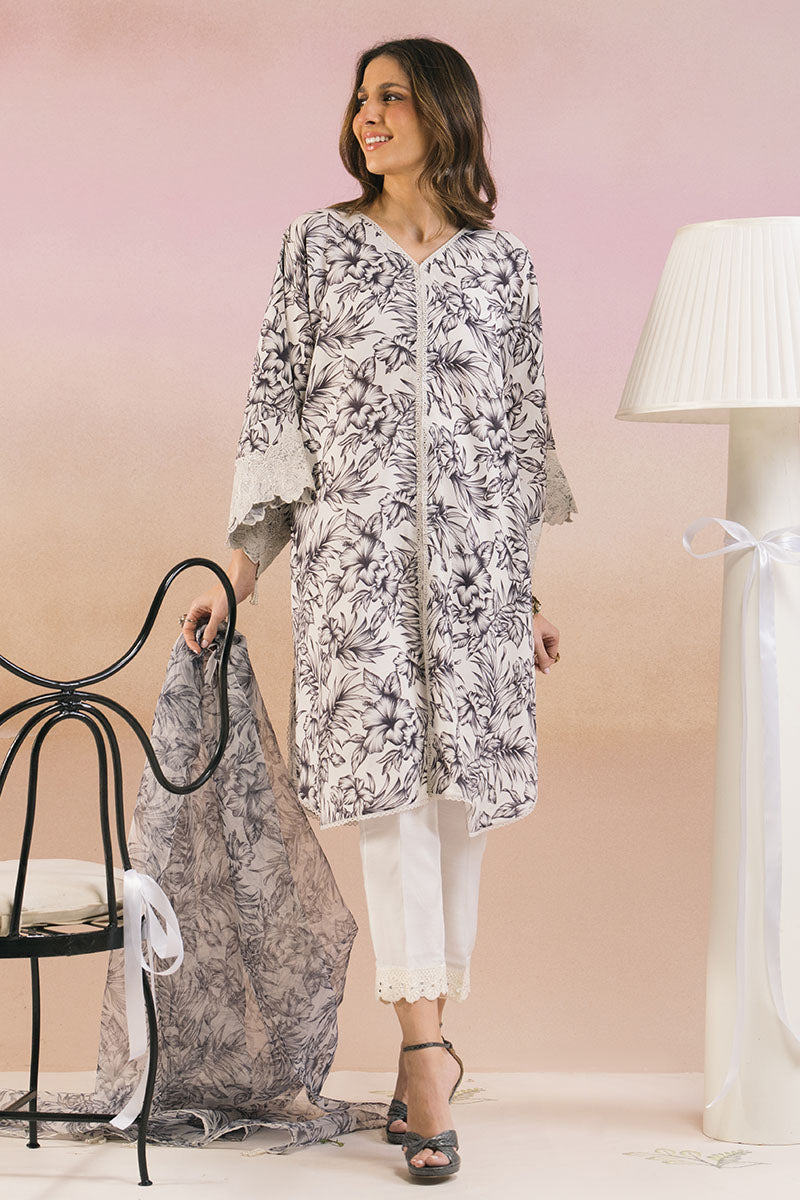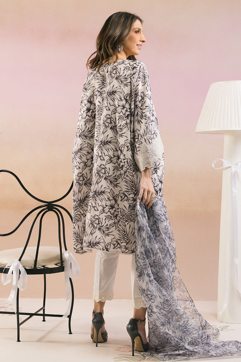 Experience Elegance And Sophistication With Our Smokey White Embroidered Shirt And Dupatta Set. The Kaftan-Style Silk Shirt Features A Front Open Design With Embroidered Front Slit And Lace Detail, While The Back Is Printed With Lace And Side Slits. The V-Neckline Is Beautifully Embroidered And The Flared Sleeves Come With Embroidery And Taselling Detail. The Accompanying Organza Printed And Embroidered Dupatta Adds The Perfect Finishing Touch With Tasseling Detail. Elevate Your Wardrobe With This Stunning Set.
